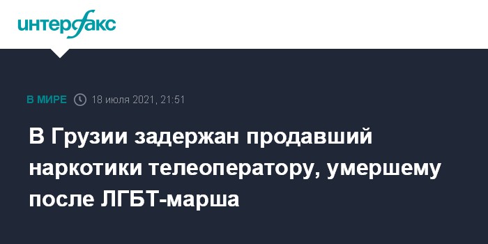 Москва. 18 июля. INTERFAX.RU - Грузинские полицейские задержали человека по обвинению в продаже наркотиков оператору TV Pirveli Александру Лашкараве, который был избит на марше противниками ЛГБТ и через несколько дней умер.