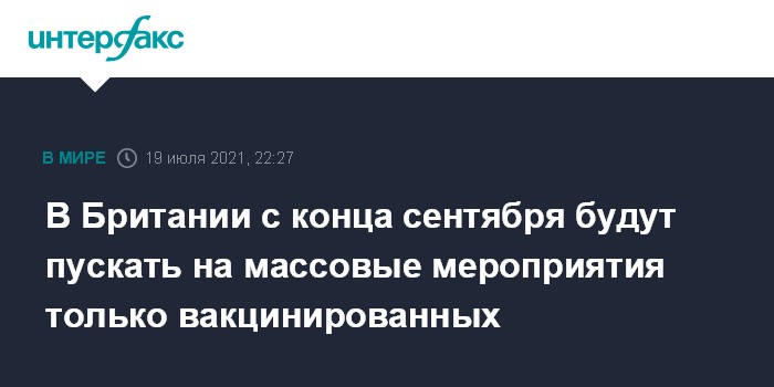 Согласно плану главы британского правительства, к концу сентября все англичане старше 18 лет получат возможность привиться от COVID-19, и потому с того момента можно будет пускать людей на массовые мероприятия только при предъявлении сертификата о вакцинации. Отрицательного теста на COVID-19 тогда будет недостаточно, предупредил британский премьер. Кроме того, Джонсон заверил, что считает правильным свое решение с понедельника отменить ограничения в Англии, призванные замедлить распространение коронавируса.