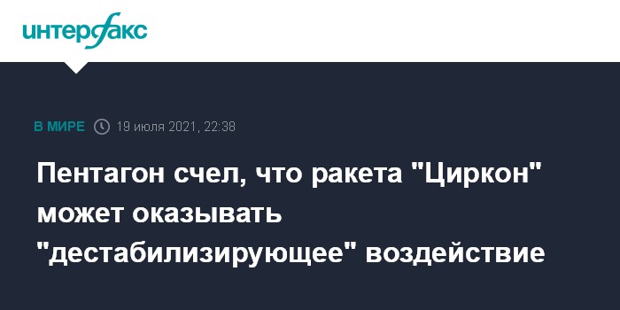 Москва. 19 июля. INTERFAX.RU - В Пентагоне видели сообщения об испытании в России гиперзвуковой ракеты "Циркон" и считают, что такого рода вооружение оказывает дестабилизирующее воздействие, заявил представитель американского военного ведомства Джон Кирби.