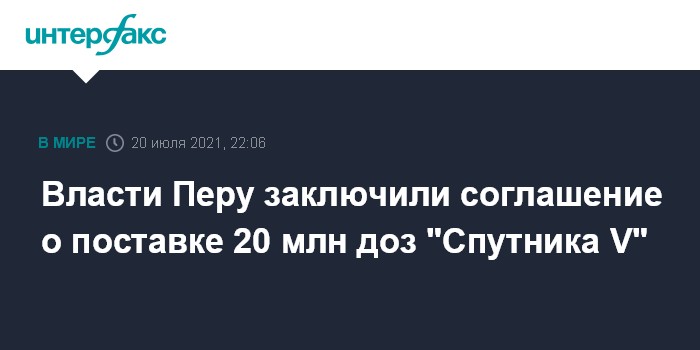 Москва. 20 июля. INTERFAX.RU - Власти Перу подписали соглашение о закупке 20 млн доз российской вакцины от коронавируса COVID-19 "Спутник V", сообщил во вторник временный перуанский президент Франсиско Сагасти.