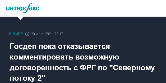 Москва. 20 июля. INTERFAX.RU - Госдепартамент США пока не готов делать объявления по поводу возможного соглашения Вашингтона и Берлина по поводу "Северного потока 2", однако в скором времени ситуация может измениться, заявил во вторник представитель американского внешнеполитического ведомства Нед Прайс.