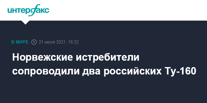 Москва. 21 июля. INTERFAX.RU - Норвегия поднимала в воздух свои истребители F-16 для сопровождения российских ракетоносцев Ту-160, которые совершили многочасовой полет над нейтральными водами Баренцева и Норвежского морей, сообщили в среду в Минобороны РФ.