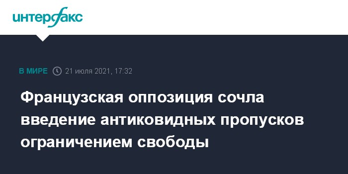 Москва. 21 июля. INTERFAX.RU - Лидеры ряда французских партий, в том числе глава ультраправого "Национального объединения" Марин Ле Пен, выразили недовольство решением правительства о введении в стране "санитарных пропусков" для посещения ряда общественных мест.