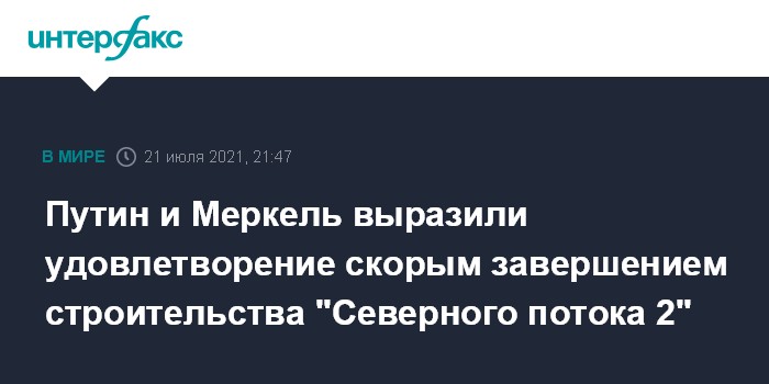 "Лидеры удовлетворены приближающимся к завершению строительством газопровода "Северный поток 2". Президент России отметил последовательную приверженность германской стороны реализации данного проекта, носящего исключительно коммерческий характер и направленного на укрепление энергобезопасности Германии и Евросоюза", - говорится в сообщении, поступившем в "Интерфакс".