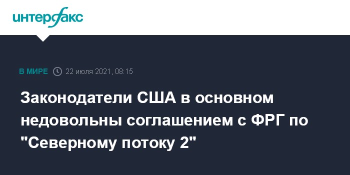 Москва. 22 июля. INTERFAX.RU - Большинство законодателей США, независимо от партийной принадлежности, негативно отреагировали на соглашение, достигнутое администрацией президента Джо Байдена и властями ФРГ по проекту газопровода "Северный поток 2".