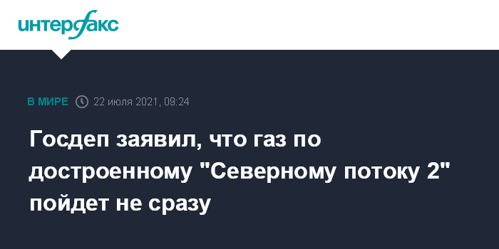 Москва. 22 июля. INTERFAX.RU - Газ по "Северному потоку 2" пойдет после завершения строительства трубопровода не сразу, необходимы дополнительные шаги, заявил журналистам на специальном телефонном брифинге представитель Госдепартамента США.
