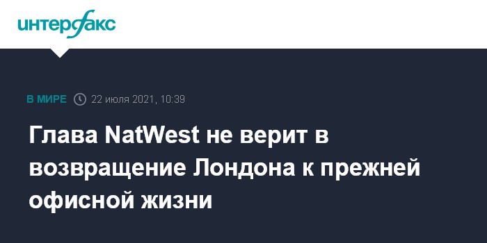 Москва. 22 июля. INTERFAX.RU - Лондонская офисная жизнь вряд ли вернется к тому, что было до пандемии, заявил Bloomberg Говард Дэвис, председатель совета директоров одного из крупнейших британских банков NatWest Group Plc.