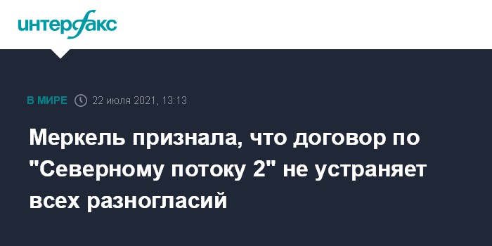 Москва. 22 июля. INTERFAX.RU - Соглашение ФРГ и США по проекту газопровода "Северный поток 2" не отменяет все разногласия между сторонами по этой проблеме, заявила в четверг канцлер ФРГ Ангела Меркель.