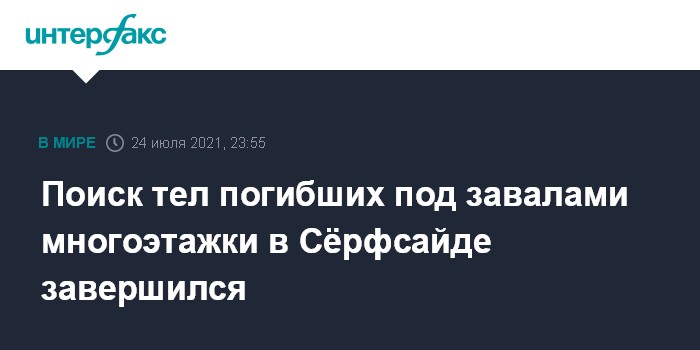 Обрушение высотного многоквартирного жилого дома в Сёрфсайде произошло 24 июня. На протяжении двух недель спасатели продолжали надеяться найти выживших, с 7 июля работы на месте происшествия перешли в статус поисковых.