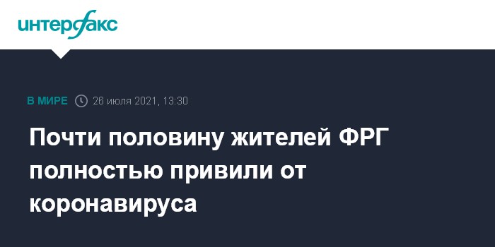 Москва. 26 июля. INTERFAX.RU - Около половины граждан Германии получили по две прививки от коронавируса COVID-19, сообщил в понедельник глава Минздрава ФРГ Йенс Шпан.