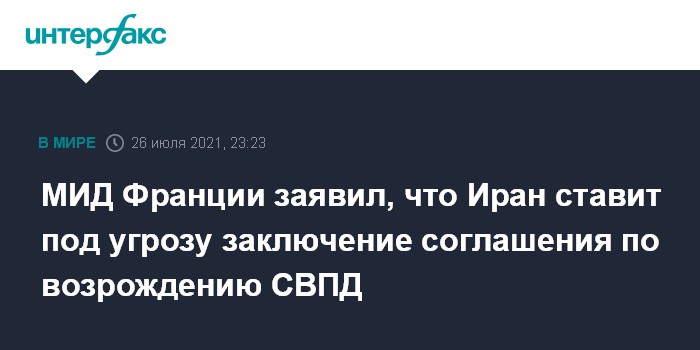 Москва. 26 июля. INTERFAX.RU - В МИД Франции в понедельник заявили, что Иран, не возвращаясь к переговорам по ядерной сделке, ставит под угрозу заключение соглашения по возрождению Совместного всеобъемлющего плана действий (СВПД), сообщают западные СМИ.