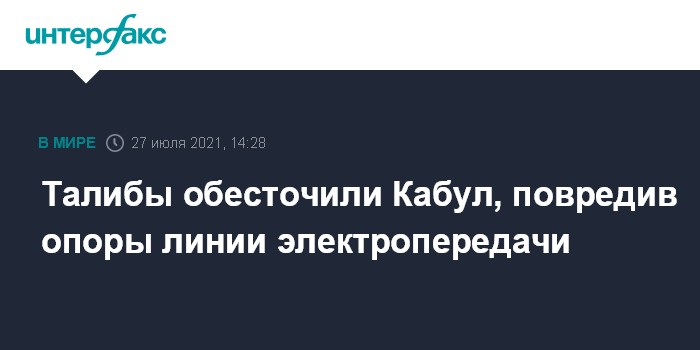 Москва. 27 июля. INTERFAX.RU - Боевики движения "Талибан" (запрещено в РФ) совершили подрыв опор ЛЭП в провинции Баглан, оставив Кабул и близлежащие к нему провинции без света. Об этом сообщила во вторник афганская национальная энергетическая компания "Брешна".