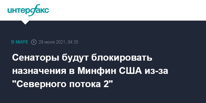 Москва. 29 июля. INTERFAX.RU - Группа сенаторов-республиканцев американского Конгресса в письме на имя министра финансов США Джанет Йеллен предупредила, что заблокирует двух кандидатов в Казначейство, если администрация не изменит свою позицию по "Северному потоку 2" и не введет новые санкции в отношении проекта.