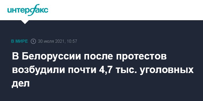 Москва. 30 июля. INTERFAX.RU - Следственный комитет Белоруссии возбудил 4 691 уголовное дело, связанное с акциями протеста после президентских выборов 2020 года.