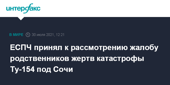 Москва. 30 июля. INTERFAX.RU - Европейский суд по правам человека принял к рассмотрению жалобу 70 родственников погибших в авиакатастрофе под Сочи самолета Минобороны РФ Ту-154 в 2016 году, в которой заявители просят признать нарушенным их право на справедливое судебное разбирательство, а также настаивают на необоснованности прекращения уголовного дела.