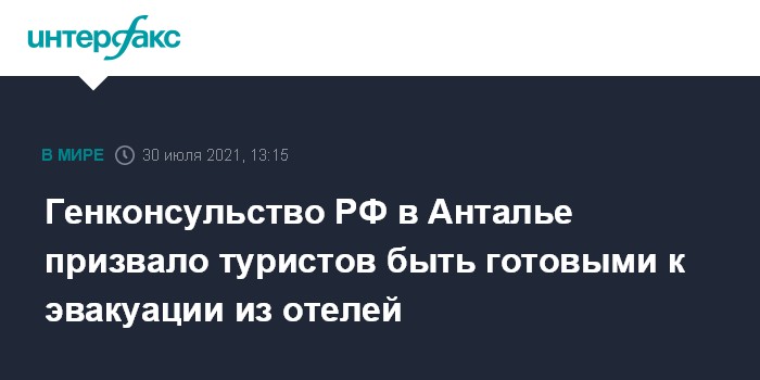 Москва. 30 июля. INTERFAX.RU - Генеральное консульство РФ в Анталье призвало российских туристов, отдыхающих в пожароопасных районах побережья Турции, быть готовыми к эвакуации из отелей, при этом ситуация в курортных зонах, по информации дипломатов, улучшается.