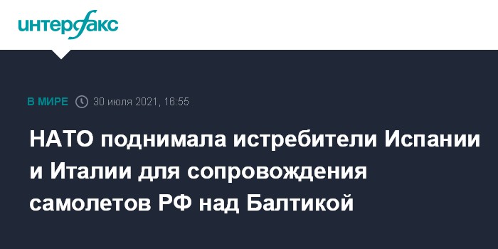 Москва. 30 июля. INTERFAX.RU - Командование НАТО накануне направляло испанские истребители Eurofighter и итальянские истребители-бомбардировщики F-35 для сопровождения самолетов РФ, летевших над Балтийским морем, говорится в обнародованном в пятницу заявлении альянса.