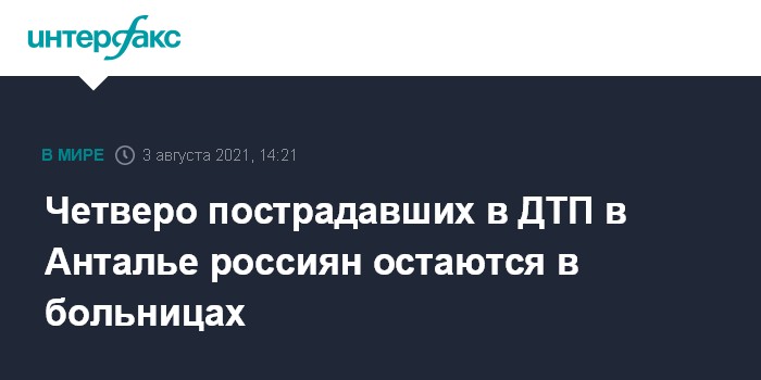Москва. 3 августа. INTERFAX.RU - Четверо пострадавших в ДТП в Анталье российских туристов остаются в больницах, остальные выписаны, сообщает пресс-служба Ростуризма со ссылкой на данные туроператора.