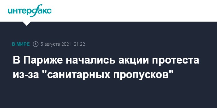 Москва. 5 августа. INTERFAX.RU - Лидеры оппозиционных французских партий выразили недовольство в своих социальных сетях после того, как Конституционный совет одобрил законопроект, предусматривающий, в частности, расширение сферы применения "санитарных пропусков"; в свою очередь, СМИ сообщают о том, что в Париже начались акции протеста против этого законопроекта.
