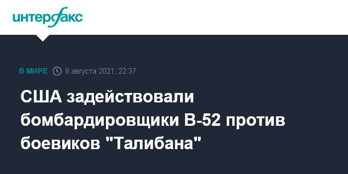 Москва. 9 августа. INTERFAX.RU - Наступление движения "Талибан" (запрещено в РФ) идет в Афганистане такими темпами, что США приходится задействовать против боевиков наиболее мощные силы своей авиации, сообщают в понедельник американские СМИ.