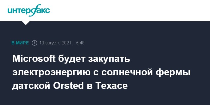 Москва. 10 августа. INTERFAX.RU - Датская Orsted AS, работающая в сфере возобновляемой энергетики, будет поставлять американской Microsoft электроэнергию, производимую ее солнечной электростанцией в Техасе.