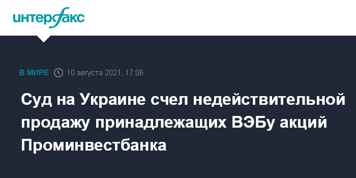 Москва. 10 августа. INTERFAX.RU - Северный апелляционный хозяйственный суд удовлетворил апелляционную жалобу ВЭБа к министерству юстиции Украины, бирже ПФТС и ФК "Фортифай", отменив решение Хозсуда Киева от 11 февраля и признав недействительной продажу принадлежащих российской госкорпорации 99,77% акций украинского Проминвестбанка (ПИБ).