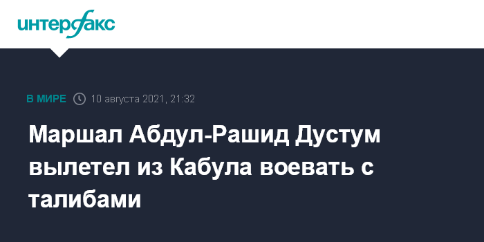 Москва. 10 августа. INTERFAX.RU - Бывший вице-президент Афганистана, лидер партии Национальное исламское движения (НИДА, объединяет тюркоязычное население Афганистана) маршал Абдул Рашид Дустум спецрейсом вылетел из Кабула в Мазари-Шариф, центр провинции Балх, воевать с талибами, сообщило молодежное крыло НИДА.