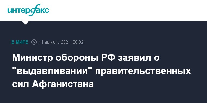 Москва. 10 августа. INTERFAX.RU - После ухода США из Афганистана началось повсеместное выдавливание правительственных сил, сообщил министр обороны РФ Сергей Шойгу.