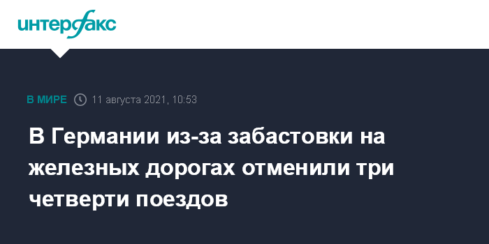 Москва. 11 августа. INTERFAX.RU - Забастовка профсоюза сотрудников железнодорожного транспорта GDL проходит в Германии, выполняется только четверть рейсов, сообщается на сайте железнодорожной компании Deutsche Bahn.