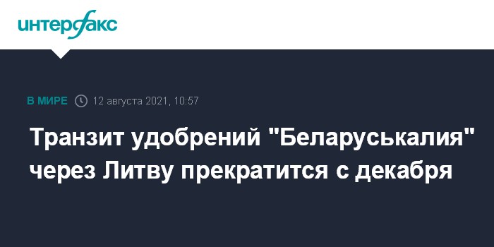 Москва. 12 августа. INTERFAX.RU - Продукция белорусского производителя калийных удобрений "Беларуськалий" не будет перевозиться через Литву с декабря. Влияние на это оказали санкции США в отношении Белоруссии, заявил министр транспорта Марюс Скуодис.