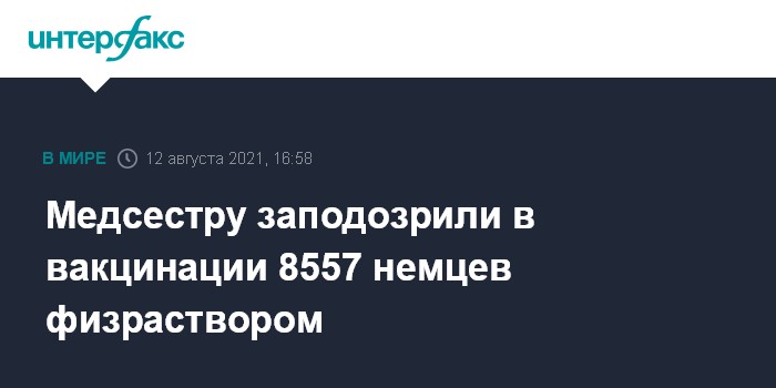 Москва. 12 августа. INTERFAX.RU - В Нижней Саксонии 8557 человек пригласили на повторную вакцинацию от коронавируса, поскольку возниклии подозрения, что вместо препарата производства Pfizer/BioNTech медсестра им вкалывала физраствор, сообщает региональная телекомпания NDR.