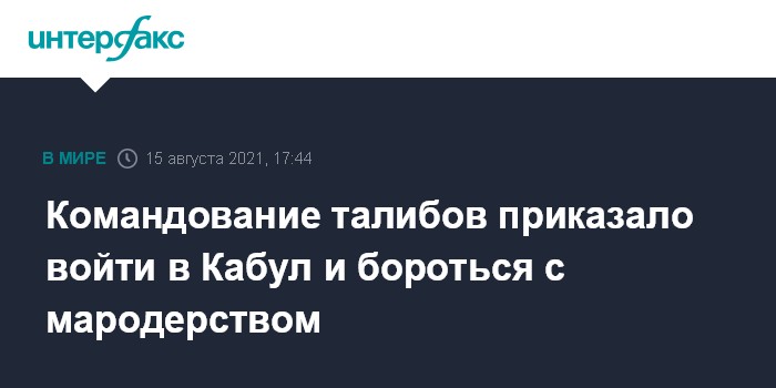 Москва. 15 августа. INTERFAX.RU - Командование движения "Талибан" (запрещено в РФ) распорядилось, чтобы его силы вошли в Кабул для "воспрепятствования мародерству", сообщил телеканал Sky news со ссылкой на представителя талибов.