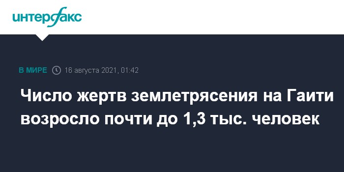 Москва. 16 августа. INTERFAX.RU - Число жертв мощного землетрясения на Гаити возросло почти до 1,3 тысячи человек, свыше 5,7 тысяч человек получили ранения и травмы, передают западные СМИ.