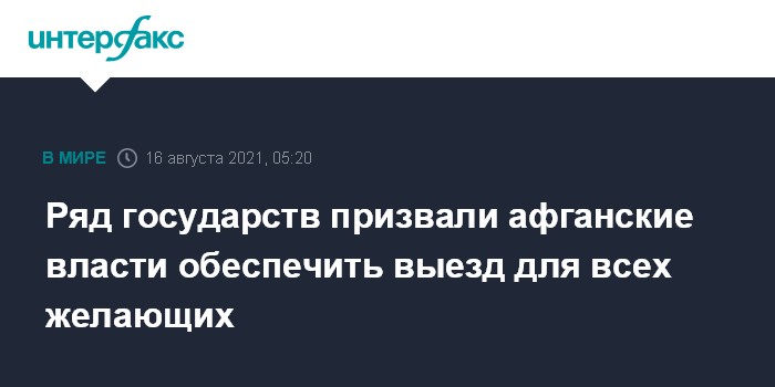 Москва. 16 августа. INTERFAX.RU - Госдепартамент США распространил совместное заявления ряда стран, в котором они призывают все афганские стороны обеспечить безопасность выезда из страны всех желающих, как иностранцев, так и местных граждан.