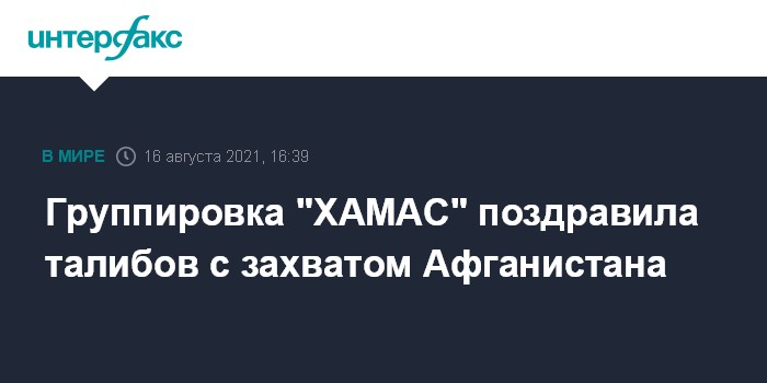 Москва. 16 августа. INTERFAX.RU - Палестинская военизированная группировка "ХАМАС", которая с 2007 года контролирует Сектор Газа, поздравила движение "Талибан" (террористическая организация, запрещена в России) с быстрым захватом Афганистана, сообщает АР.