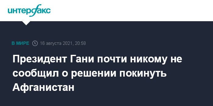Москва. 16 августа. INTERFAX.RU - Президент Афганистана Ашраф Гани покинул страну лишь с узким кругом доверенных лиц, не предупредив об этом других политических лидеров страны, сообщает в понедельник агентство Associated Press.