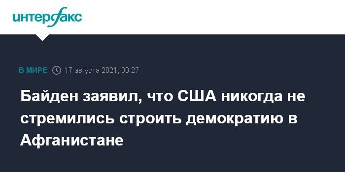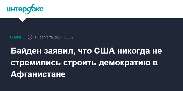 Москва. 17 августа. INTERFAX.RU - США никогда не собирались строить демократию в Афганистане, а присутствовали там, чтобы не допустить атак террористов на своей собственной территории, заявил в понедельник президент США Джо Байден.