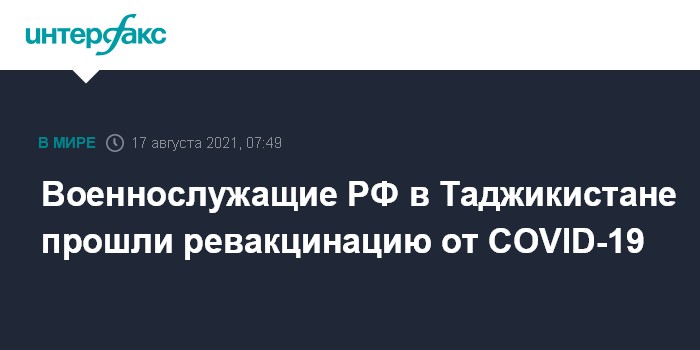 Москва. 17 августа. INTERFAX.RU - Более 3 тыс. российских военнослужащих 201-ой военной базы, дислоцированной в Таджикистане, проходят ревакцинацию от коронавируса, сообщает пресс-служба Центрального военного округа (ЦВО) во вторник.