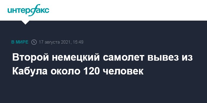 Москва. 17 августа. INTERFAX.RU - Экипажу второго немецкого транспортного рейса в Кабуле удалось больше, чем первому - самолет бундесвера A400M взял на борт для эвакуации уже не семь человек, а около 120, пишет Bild.