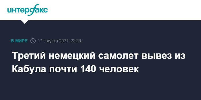 Москва. 17 августа. INTERFAX.RU - Третий немецкий военно-транспортный борт вывез из Кабула во вторник еще 139 человек, сообщил глава МИД ФРГ Хайко Маас в эфире телеканала ZDF.