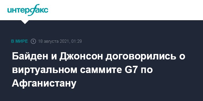 Москва. 18 августа. INTERFAX.RU - Президент США Джо Байден и премьер-министр Великобритании Борис Джонсон во время телефонного разговора договорились об организации на следующей неделе виртуального саммита G7 для обсуждения темы Афганистана, сообщает Белый дом.