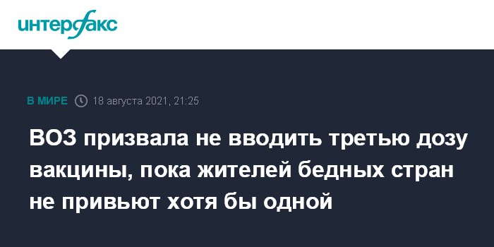 ВОЗ призвала не вводить третью дозу вакцины, пока жителей бедных стран не привьют хотя бы одной