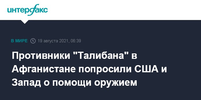 Москва. 19 августа. INTERFAX.RU - Противники талибов ("Талибан" - запрещенная в РФ террористическая организация) обратились с просьбой к США и Западу о поставках оружия и снаряжения для борьбы против захватившего власть в стране движения "Талибан".