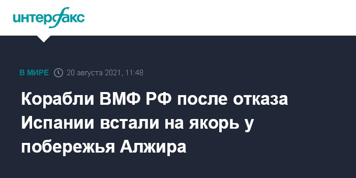 Москва. 20 августа. INTERFAX.RU - Большой противолодочный корабль "Вице-адмирал Кулаков" и спасательное судно "Алтай", которым испанские власти не дали разрешение зайти в порт Сеута (испанский анклав на севере Африки), встали на якорь в 46 км от побережья Алжира, сообщили в соцсетях гибралтарские наблюдатели.