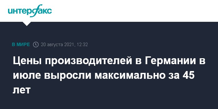 Москва. 20 августа. INTERFAX.RU - Цены производителей в Германии в июле выросли на 10,4% по сравнению с тем же месяцем прошлого года, свидетельствуют данные Федерального статистического управления страны (Destatis).