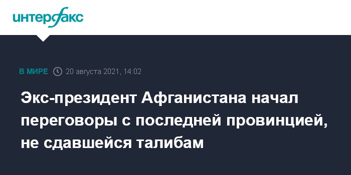 Москва. 20 августа. INTERFAX.RU - Глава Высшего совета по национальному примирению в Афганистане Абдулла Абдулла и экс-президент (2004-2014 гг.) Хамид Карзай прибыли в Панджшер на переговоры с лидерами единственной афганской провинции, оставшейся неподконтрольной талибам (боевикам "Талибана" – запрещенного в России террористического движения).