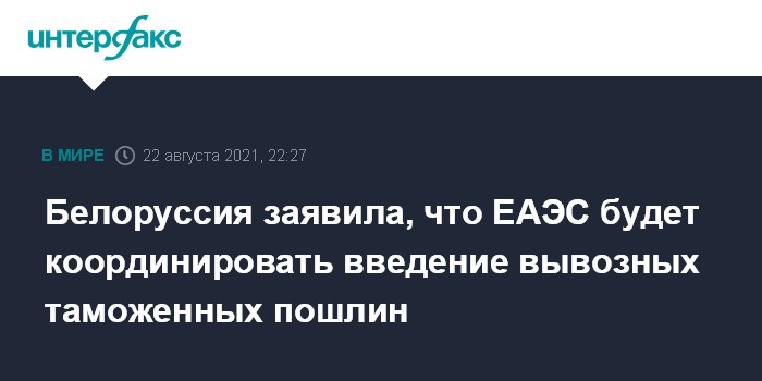 Москва. 22 августа. INTERFAX.RU - Страны ЕАЭС будут координировать введение вывозных таможенных пошлин, сообщил премьер-министр Белоруссии Роман Головченко.
