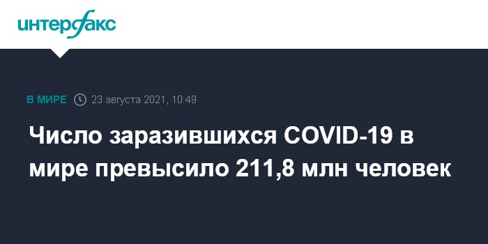 Москва. 23 августа. INTERFAX.RU - Число зарегистрированных случаев коронавируса COVID-19 в мире на утро понедельника составило 211 844 766, сообщил американский университет Джонса Хопкинса.