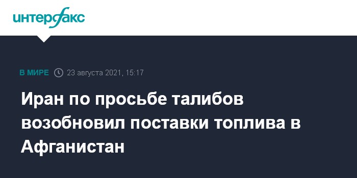 Москва. 23 августа. INTERFAX.RU - Иран возобновил поставки бензина и дизельного топлива в Афганистан после получения соответствующей просьбы от движения "Талибан" (террористическая организация, запрещена в РФ). Об этом сообщает в понедельник Al Jazeera.