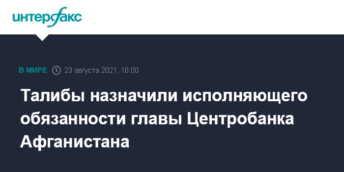 Москва. 23 августа. INTERFAX.RU - Движение "Талибан" (террористическая организация, запрещена в РФ), захватившее власть в Афганистане, назначило Хаджи Мухаммеда Идриса исполняющим обязанности управляющего Центробанком страны, передают в понедельник западные СМИ со ссылкой на заявление талибов.